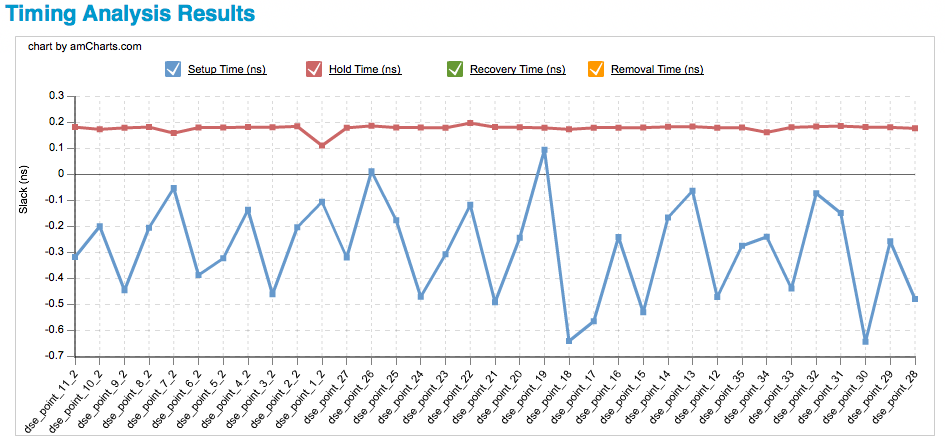 - Only iterations "dse_point_19" and "dse_point_26" had the passing timing results. (Mouse-over the "i" icons in the table to see which parameters were used in each iteration (revision).