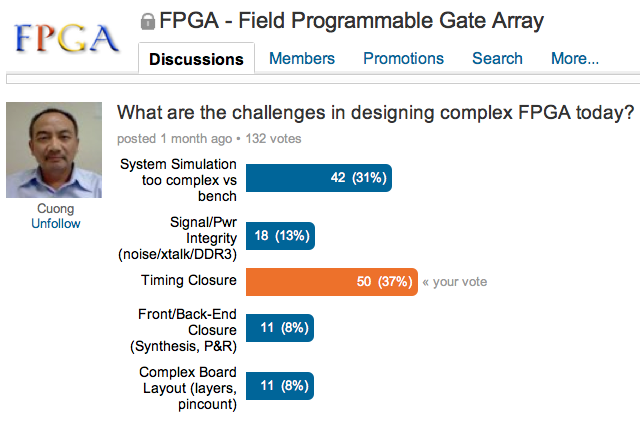 A poll on the challenges associated with FPGA design in an FPGA discussion group on LinkedIn caught my attention recently. Conducted by Cuong Nguyen from EDA Direct, it drew several lengthy comments.